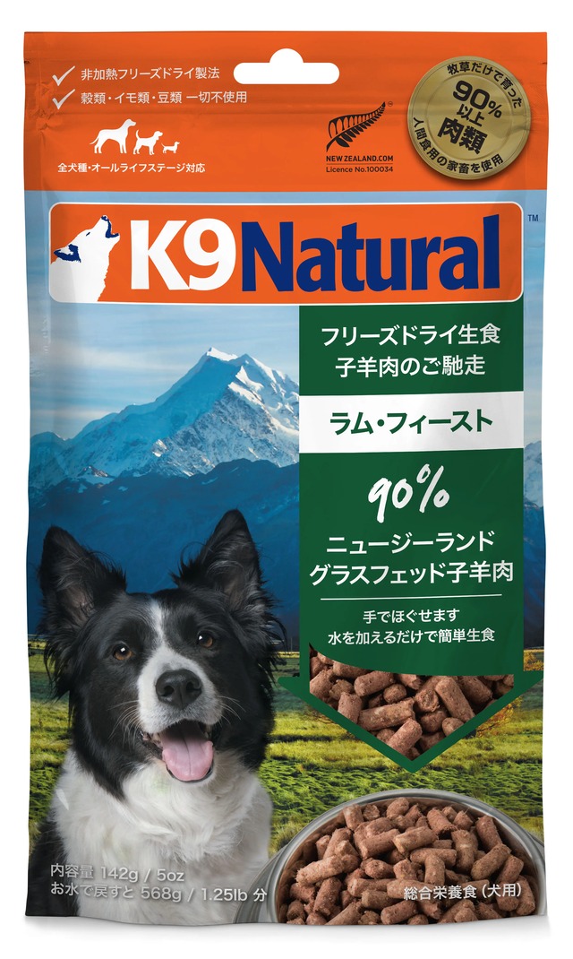 【 K9Natural ラム・フィースト 】 特殊フリーズドライ製法により、素材の栄養素 風味をそのまま生かした本来の食事を。 ヘルシーな「ラム肉」がカラダを温めてくれます。 脂肪を燃焼しやすくする”L-カルニチン”を多く含む ラム肉がカラダを温め、代謝などを高める効果も。 ◆特徴 お肉を90%以上使用 家畜・家禽の疫病ゼロの国、ニュージーランド産 穀類、イモ類、豆類、一切不使用 人工保存料、人工着色料、人工香料、一切不使用 全年齢、全犬種対応 食材はすべてヒューマングレード AAFFCO基準クリア ◆内容量:3.6kg ※取り寄せ後、配送 ※展開サイズ:15g / 142g / 500g / 1.8kg ●お取り寄せ商品 ◆原産国:ニュージーランド ◆原材料:画像にて掲載 ◆給与量:画像にて掲載